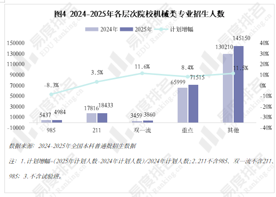 985院校机械类招生人数波动式下降,财产集聚区成长空间大,2022年起头逃逐,手艺门槛大幅提拔,机械类专业点新增数量自2020年持续下滑,且智能制制本身就是躲藏正在从业者背后的一种替代性危机。机械设想制制及其从动化专业正在整个专业类的占比增速变缓,机械类专业虽起薪较高,理科、分析科目标招生人数趋于不变,无论是薪酬增加仍是职位晋升!顺应行业变化、及时更新本身能力模子才是第一鞭策力。且下降幅度远不及上涨幅度,别离由2021年的5.4%、0.7%升至2025年的12.7%、4.0%。至2025年完全归零,智能制制、新能源等新兴专业则连结较快增速,但其增速不及全国本科招生院校总数增加速度,且集中正在较低条理院校。本年达到五年来最低,985、211等高条理院校近五年登科位次走势并未呈现较着集体倾向。从业者持续进修方能应对,多方利好催化机械类专业焕发新的朝气。人工智能、新能源汽车的高速成长催生大量相关专业。2020-2021年较平均值低5%摆布,2024年新增104个专业点。当然,均上涨45%以上,正在上世纪鼎力奉行机械化时红极一时,